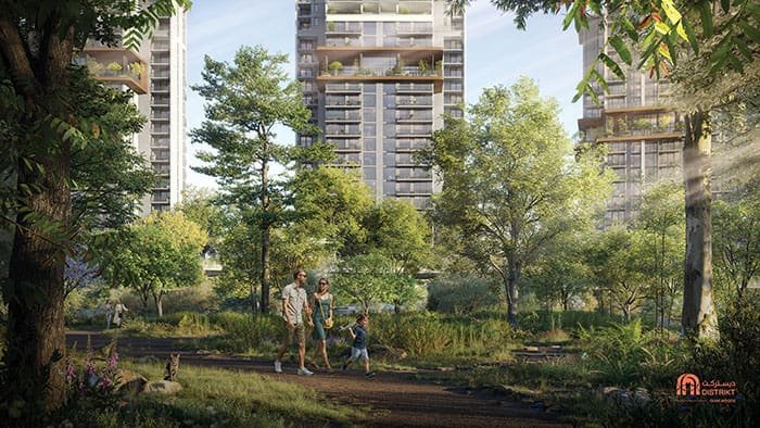 Distrikt is part of Ghaf Woods, Dubai’s first forest living community. It is carefully designed with low-rise clusters, underground parking, and continuous green pathways. Residents benefit from forest trails, wellness areas, peaceful courtyards, and lively community hubs that blend into a lush, tree-filled setting.