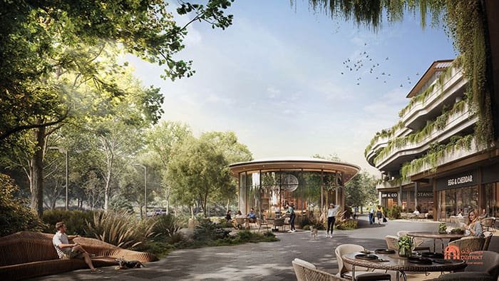 Spaces for connection and creativity, including co-working hubs, a library, nursery, amphitheatre, and community gardens.
